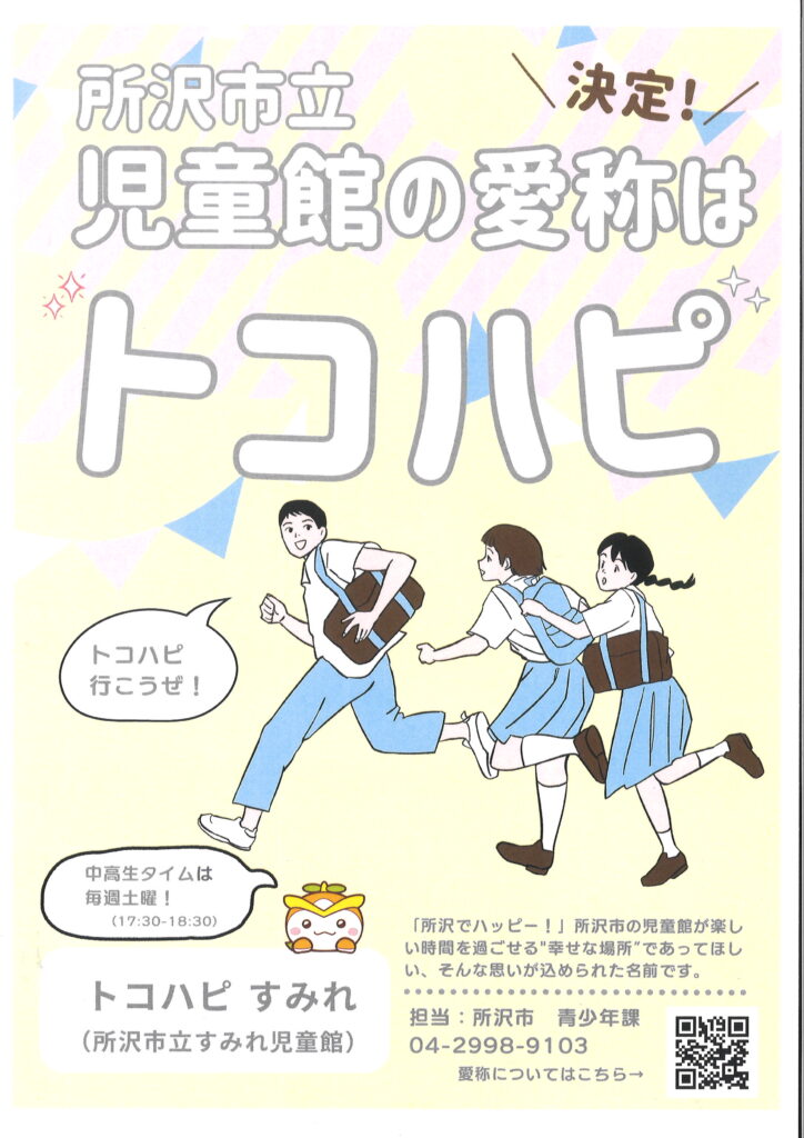 『児童館の愛称』について 投稿公開日:2025年9月26日 投稿カテゴリー:すみれ児童館 新着情報 所沢市の児童館愛称の投票に参加していただきありがとうございました。 愛称は『トコハピ』に決まりました。『トコハピに行こう!」と 誘い合って沢山遊びに来てください。 おすすめ 11/11(月)『ドッジビー大会』について 2024年10月31日 6/2(金)『プラレールであそぼう』について 2023年5月26日 児童館アンケートの集計結果について 2025年2月28日
