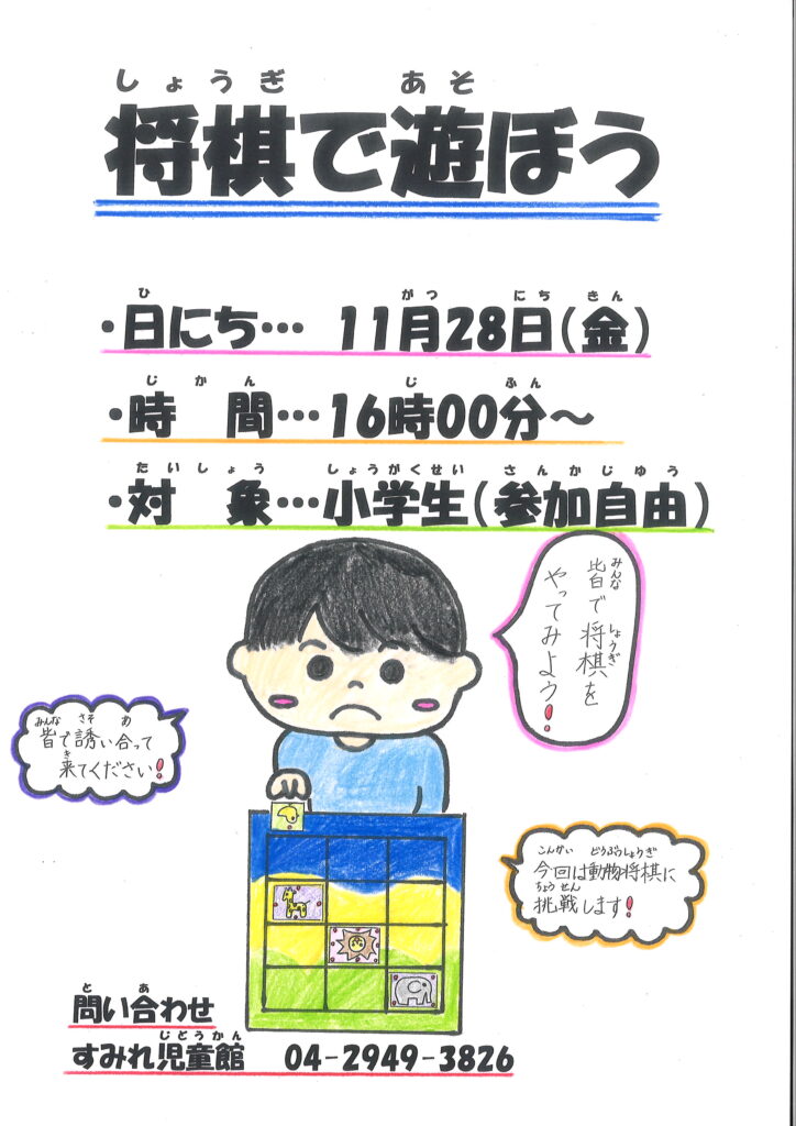 11/28(金)『将棋で遊ぼう』について 投稿公開日:2025年10月20日 投稿カテゴリー:すみれ児童館 新着情報 11/28(金)に『将棋で遊ぼう』を行います。(参加自由) 今回は動物将棋に挑戦します。みんなで一緒に遊びましょう! 詳しくはポスターをご覧ください。 おすすめ 10/11(土)『すみれまつり』について 2025年9月16日 6/2(金)『プラレールであそぼう』について 2023年5月26日 7/26(金)『スポーツday 』について 2024年7月6日