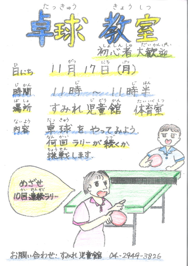 11/17(月)『卓球教室』について 投稿公開日:2025年10月27日 投稿カテゴリー:すみれ児童館 新着情報 11/17(月)に『卓球教室』を行います。(参加自由) みんなで一緒に卓球をしませんか?何回ラリーが続くか挑戦しましょう。 初心者でも大歓迎です。 詳しくはポスターをご覧ください。 おすすめ 12/21(土)『すみれクリスマス会』について 2024年11月22日 11/28(金)『将棋で遊ぼう』について 2025年10月20日 1/17(金)『カードゲームで遊ぼう』について 2024年12月26日