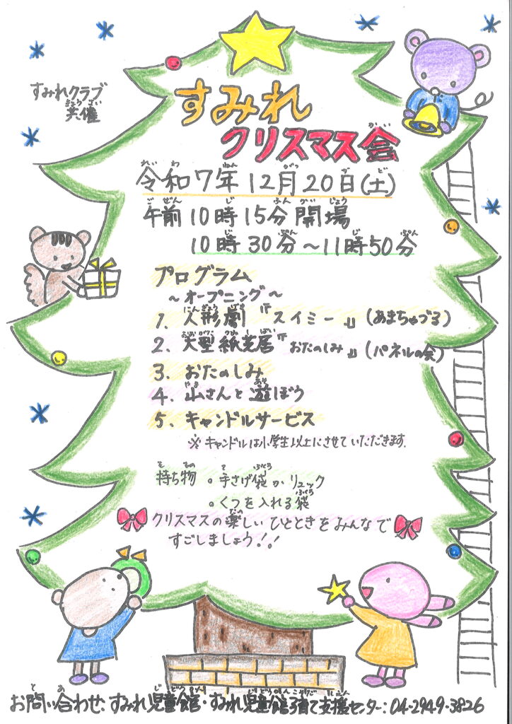 12/20(土)『すみれクリスマス会』について 投稿公開日:2025年11月18日 投稿カテゴリー:すみれ児童館 新着情報 12/20(土)に『すみれクリスマス会』を行います。(参加自由) クリスマスの楽しいひと時をみんなで過ごしましょう。 詳しくはポスターをご覧ください。 おすすめ 1/18(土)『クッキング』について 2024年12月26日 8/5(月) 『ペタンク大会』について 2024年7月25日 5/30(金)『スポーツday』について 2025年5月19日