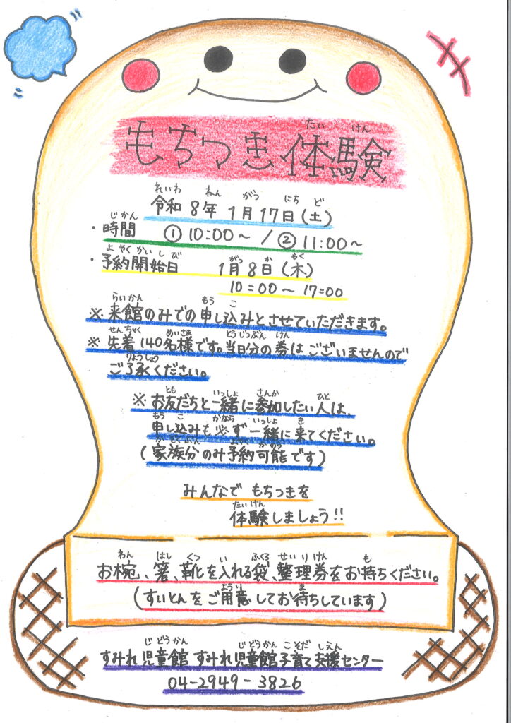 1/17(土)『もちつき体験』について 投稿公開日:2025年12月27日 投稿カテゴリー:すみれ児童館 新着情報 1/17(土)に『もちつき体験』を行います。(予約制) みんなでもちつきを体験しましょう。 詳しくはポスターをご覧ください。 おすすめ 11/17(月)『ドッジビー大会』について 2025年10月27日 6/22(土)『つくってみよう』について 2024年6月17日 9/13(土)『つくってみよう』について 2025年9月3日