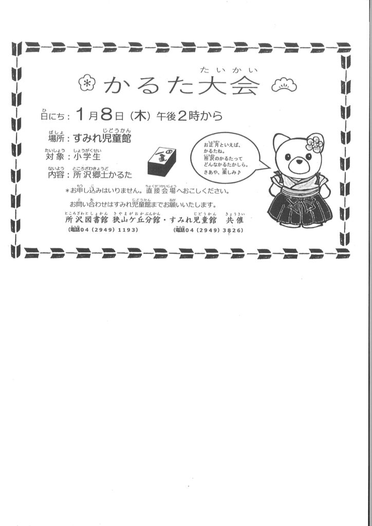 1/8(木)『図書館共催かるた大会』について 投稿公開日:2025年12月27日 投稿カテゴリー:すみれ児童館 新着情報 1/8(木)に 所沢図書館狭山ヶ丘分館共催『かるた大会』を行います。 (自由参加)所沢郷土かるたを何枚取れるか、みんなで競ってみませんか? 詳しくはポスターをご覧ください。 おすすめ 6/22(土)『つくってみよう』について 2024年6月17日 8/27(火)『百人一首大会』について 2024年8月15日 7/12(土)『すみれおばけやしき』について 2025年6月12日
