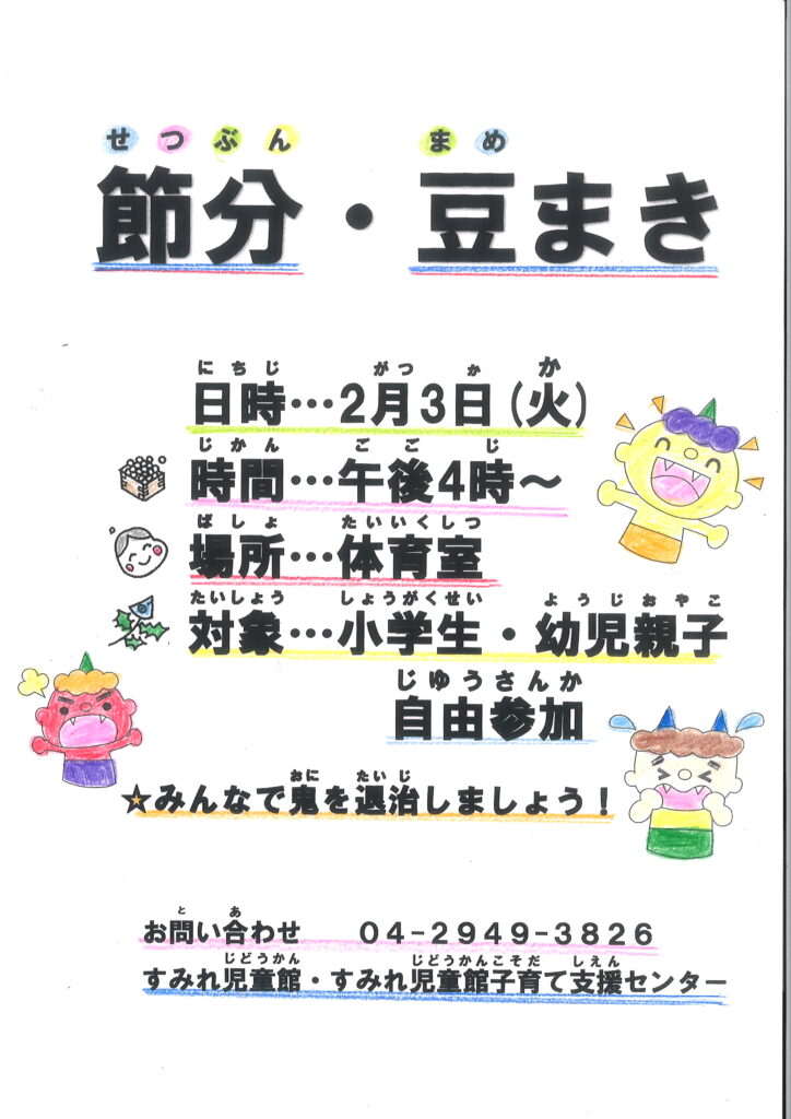 2/3(火)『節分・豆まき』について 投稿公開日:2026年1月28日 投稿カテゴリー:すみれ児童館 新着情報 2/3(火)に『節分・豆まき』を行います。(自由参加) みんなで鬼を退治しましょう。お友達を誘って来てください。 お待ちしています。詳しくはポスターをご覧ください。 おすすめ 10/14(土) 『すみれまつり』について 2023年9月14日 9/16(土) 『つくってみよう』について 2023年9月2日 7/29(火)『スポーツday』について 2025年7月16日