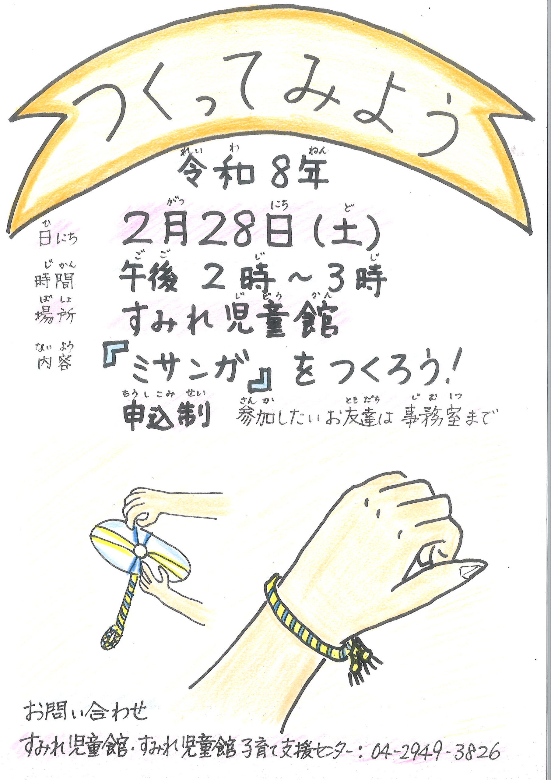 2/28(土)『つくってみよう』について 投稿公開日:2026年2月13日 投稿カテゴリー:すみれ児童館 新着情報 2/28(土)に『つくってみよう』を行います。(申し込み制) 今月は『ミサンガ』を作ります。 詳しくはポスターをご覧ください。 おすすめ 6/17(月) 『卓球教室』について 2024年6月2日 1/8(水)『図書館共催かるた大会』について 2024年12月13日 11/1(土)『忍の会』について 2025年10月27日
