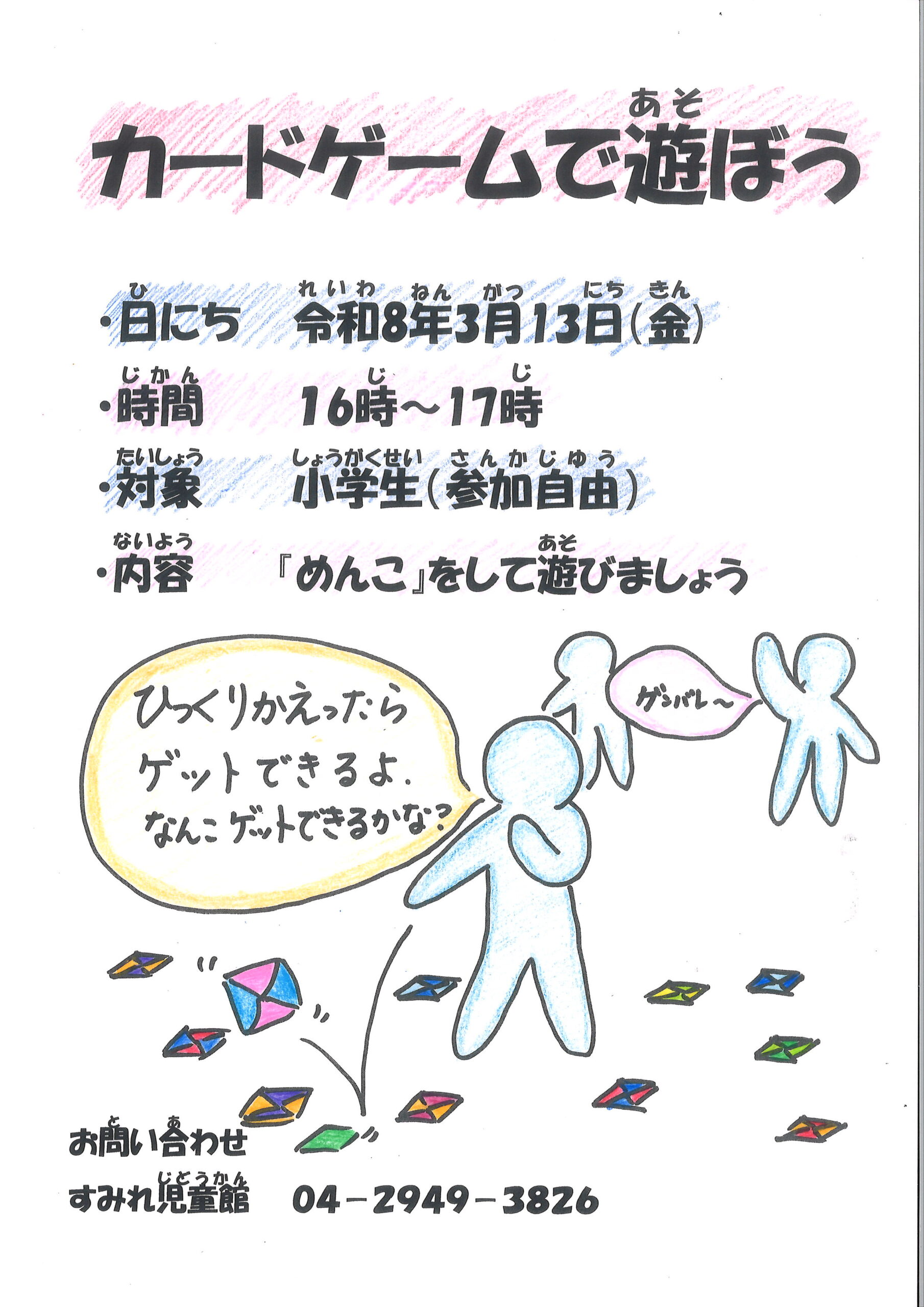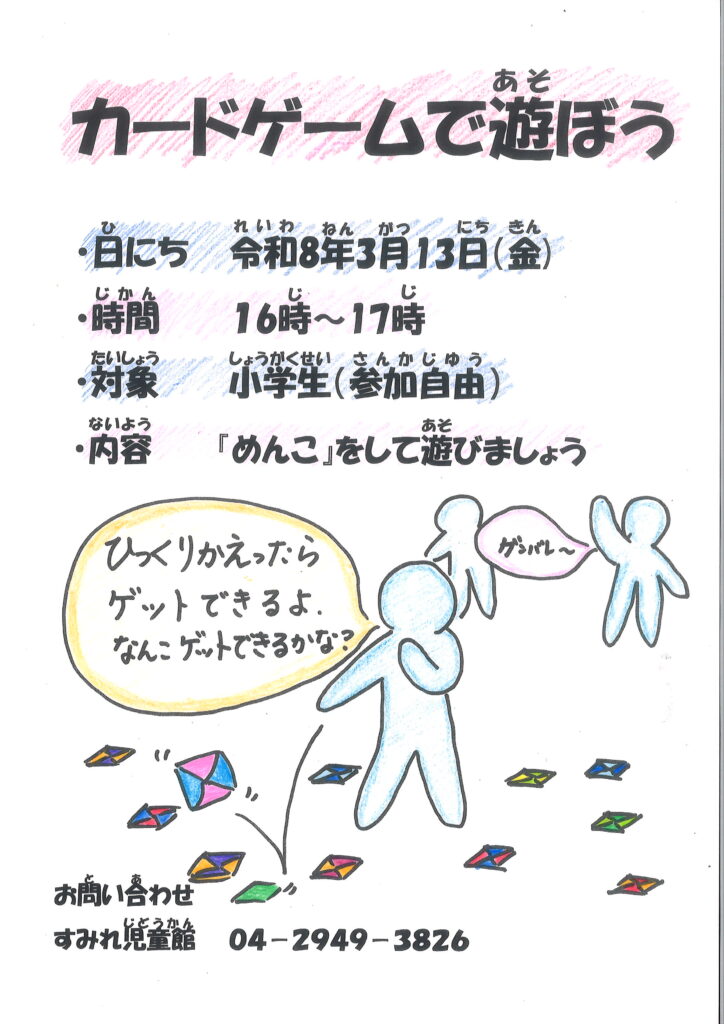 3/13(金)『カードゲームで遊ぼう』について 投稿公開日:2026年2月28日 投稿カテゴリー:すみれ児童館 新着情報 3/13(金)『カードゲームで遊ぼう』を行います。(参加自由) 今回は『めんこ』をして遊びます。 詳しくはポスターをご覧ください。 おすすめ 4/26(土)『中高生タイム』について 2025年4月22日 1/9(火) 『図書館共催かるた大会』について 2023年12月14日 3/14(金)『カードゲームで遊ぼう』について 2025年3月6日