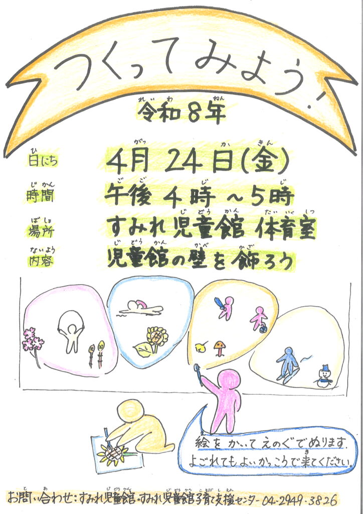 4/24(金)『つくってみよう』について 投稿公開日:2026年4月11日 投稿カテゴリー:すみれ児童館 新着情報 4/24(金)『つくってみよう』を行います。(自由参加) 児童館の体育室の壁をみんなでかざります。 詳しくはポスターをご覧ください。 おすすめ 6/23(金)『にじるーむ』について 2023年5月25日 8/27(水)『マジックショー』について 2025年8月5日 6/22(土)『つくってみよう』について 2024年6月17日