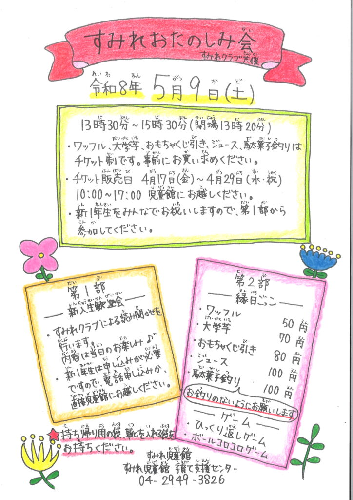5/9(土)『すみれお楽しみ会』について 投稿公開日:2026年4月11日 投稿カテゴリー:すみれ児童館 新着情報 5/9(土)に『すみれおたのしみ会』を行います。(事前チケット購入制) ※チケット予定販売枚数終了後も無料ゲームには参加いただけます。 1年生歓迎会や縁日ごっこで楽しみましょう。 詳しくはポスターをご覧ください。 おすすめ 令和8年度『幼児グループ』募集案内について 2026年2月28日 3/14(金)『カードゲームで遊ぼう』について 2025年3月6日 10/26(土) 『すみれまつり』について 2024年10月9日