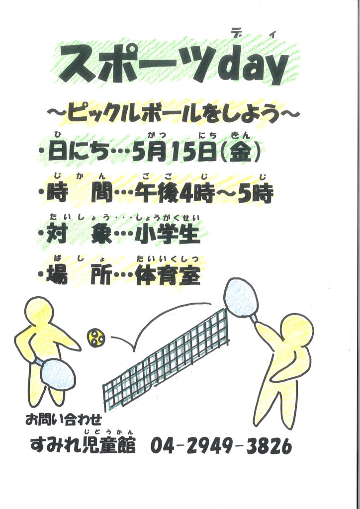 5/15(金)『スポーツday』について 投稿公開日:2026年4月25日 投稿カテゴリー:すみれ児童館 新着情報 5/15(金)に『スポーツday』を行います。(参加自由) 今回はピックルボールにチャレンジしてみましょう。 詳しくはポスターをご覧ください。 おすすめ 8/5(火)『クイズ大会』について 2025年7月22日 1/8(水)『図書館共催かるた大会』について 2024年12月13日 8/7(木)『ウォーターパーク』について 2025年8月5日